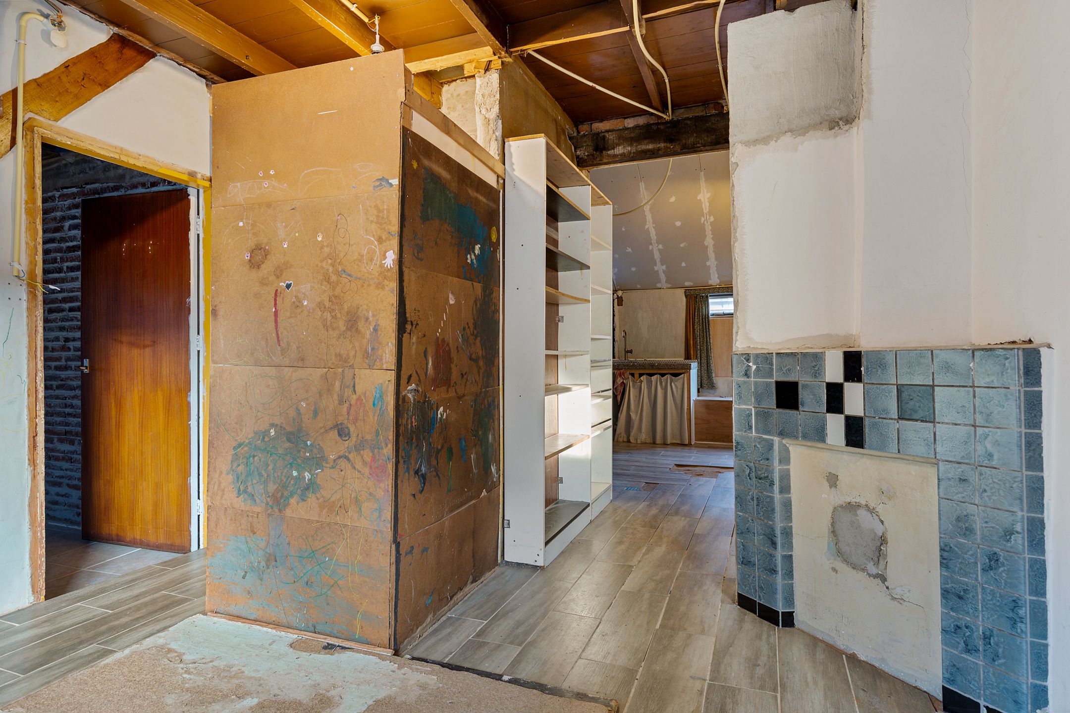 Iemand moet ooit hieraan begonnen zijn of er zelfs hebben gewoond. Er hangt een poster voor een voorstelling uit zomer '24, er ligt al wat klusmateriaal, dat stapelbed... Enorme klusburn-out? Geld op?