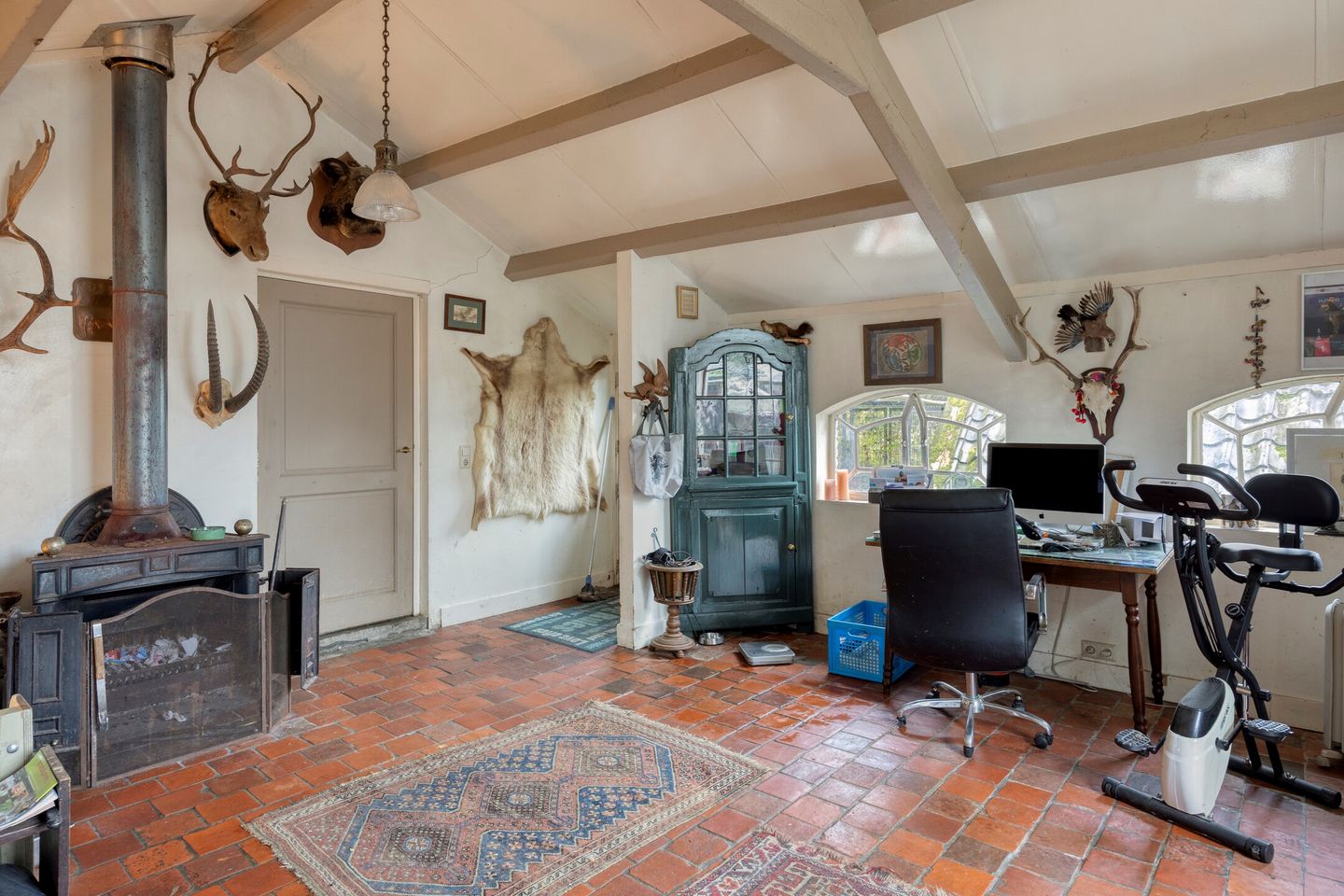 Dat magazijn/garage is het gebouwtje dat in de lengte langs de tuin staat op bovenstaande foto. Heeft een paar deuren en ramen naar de tuin, en is dus eigenlijk integraal onderdeel van het object. Maar verderop in de tekst staat dan dit:Hier vind je een ruime woon-, eet- en zitkamer, een grote keuken, vier slaapkamers, een royale zolder, én een enorm magazijn/garage die te gebruiken is voor verschillende doeleinden
