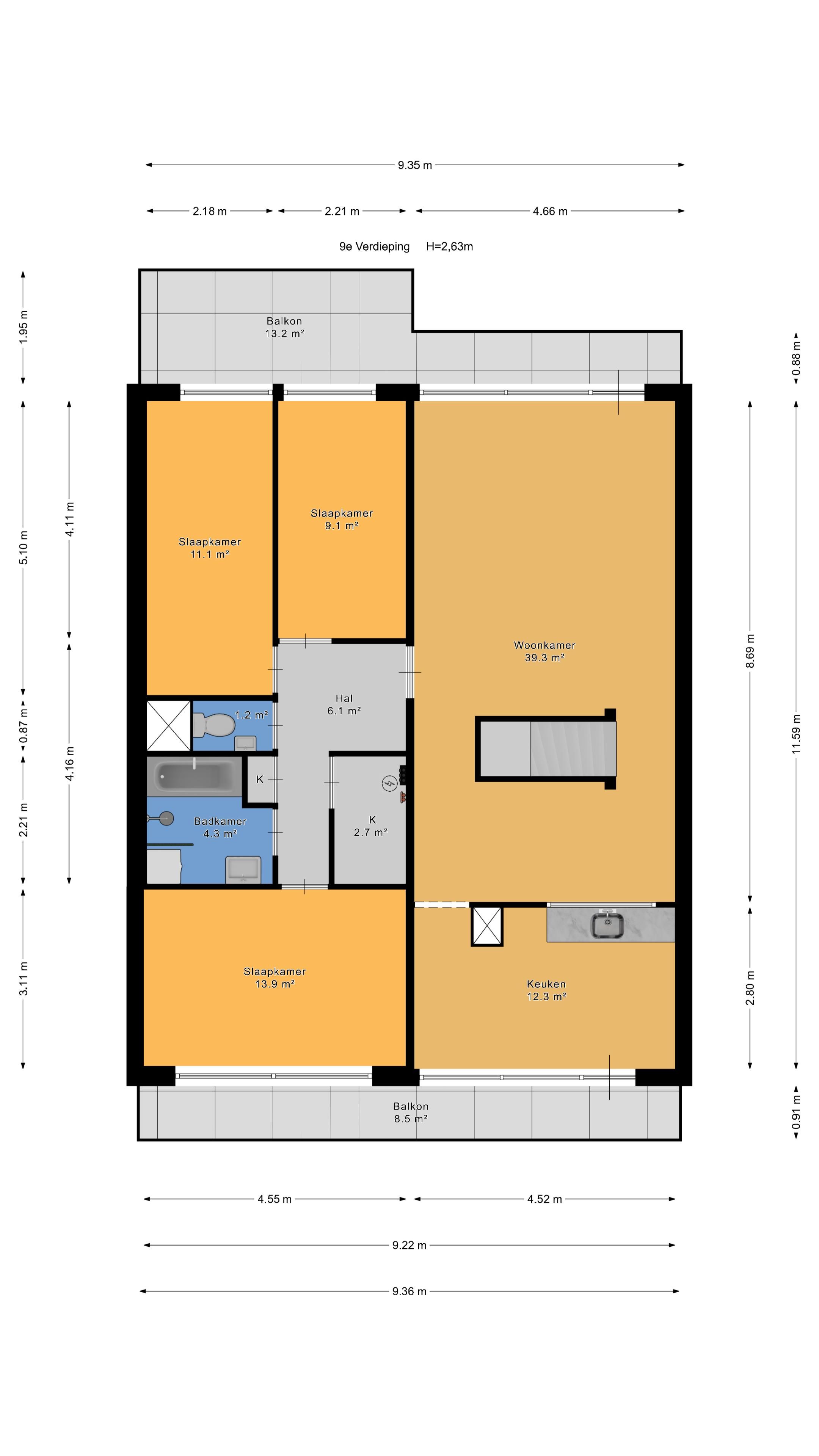 11 m² (8,70 meter diep en 1,22 meter breed)
