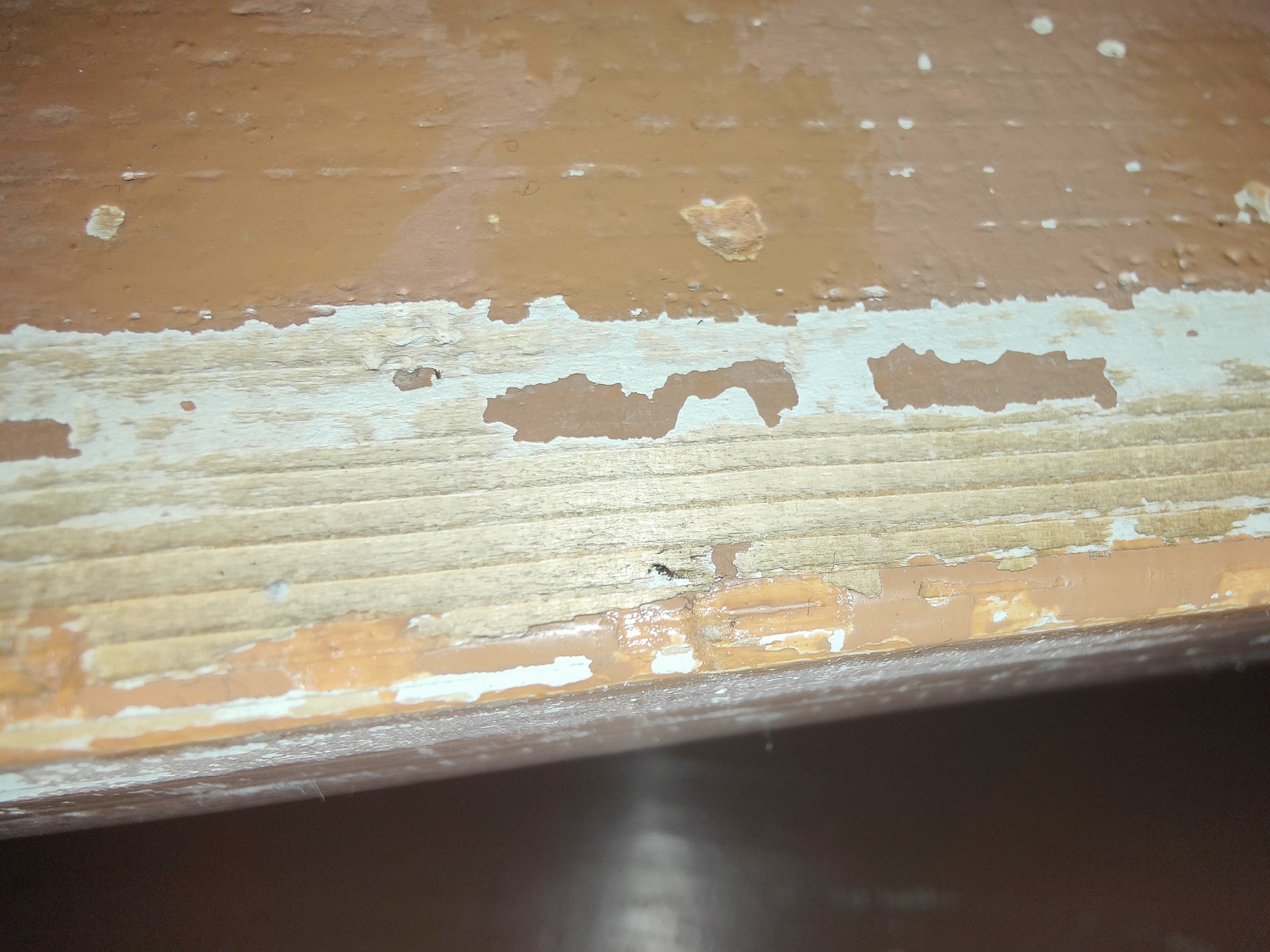Nu is de vraag, is dit uberhaupt moegelijk bij zo'n trap? Hier een close up van een trede waar de verf een stuk vanaf is: