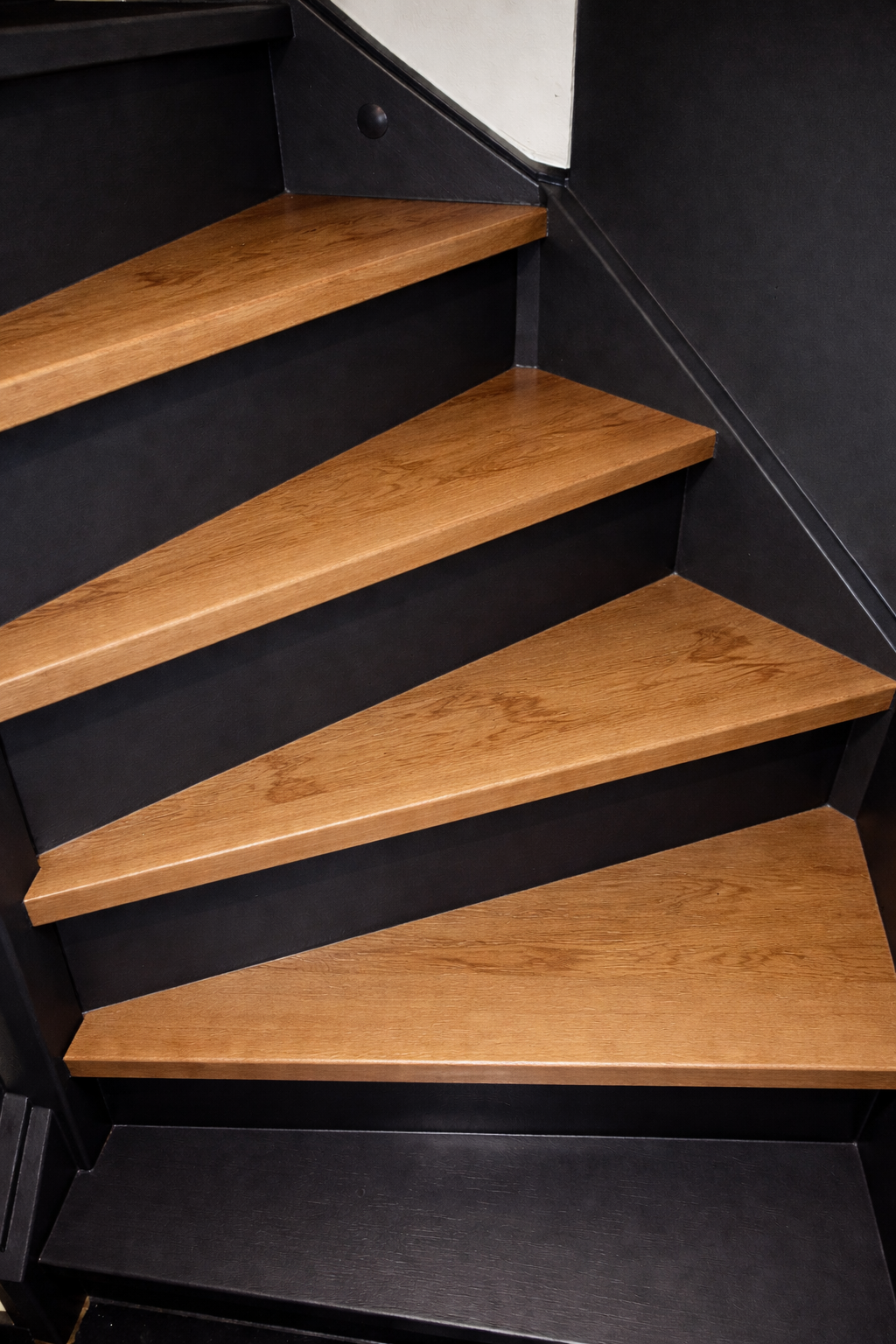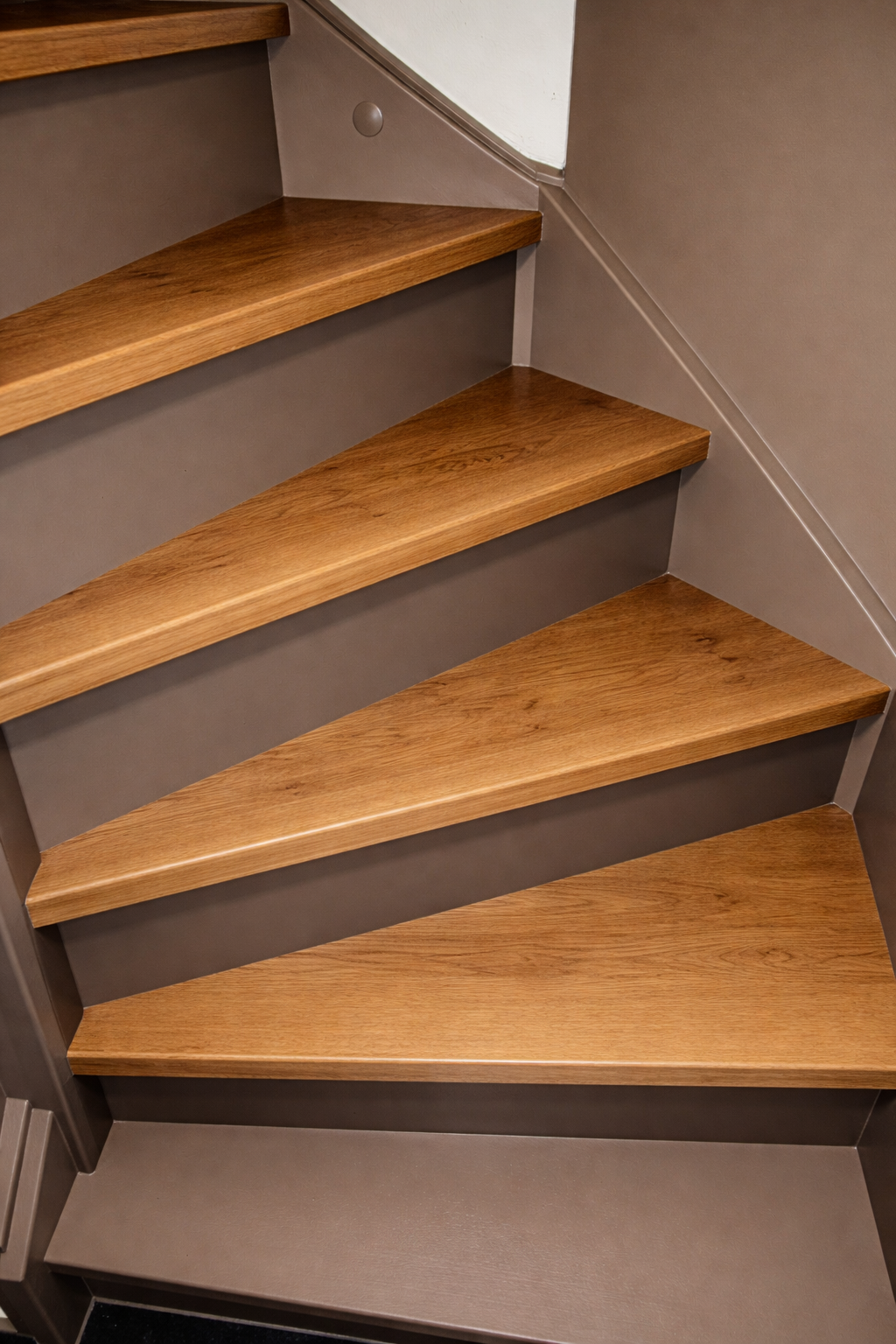 Nu hadden we het idee op de trede zelf, waar je dus op gaat staan helemaal kaal te maken en die te beitsen zodat we een houtlook krijgen, de stootborden en zijkanten etc worden dan waarschijnlijk donker (grafiet).