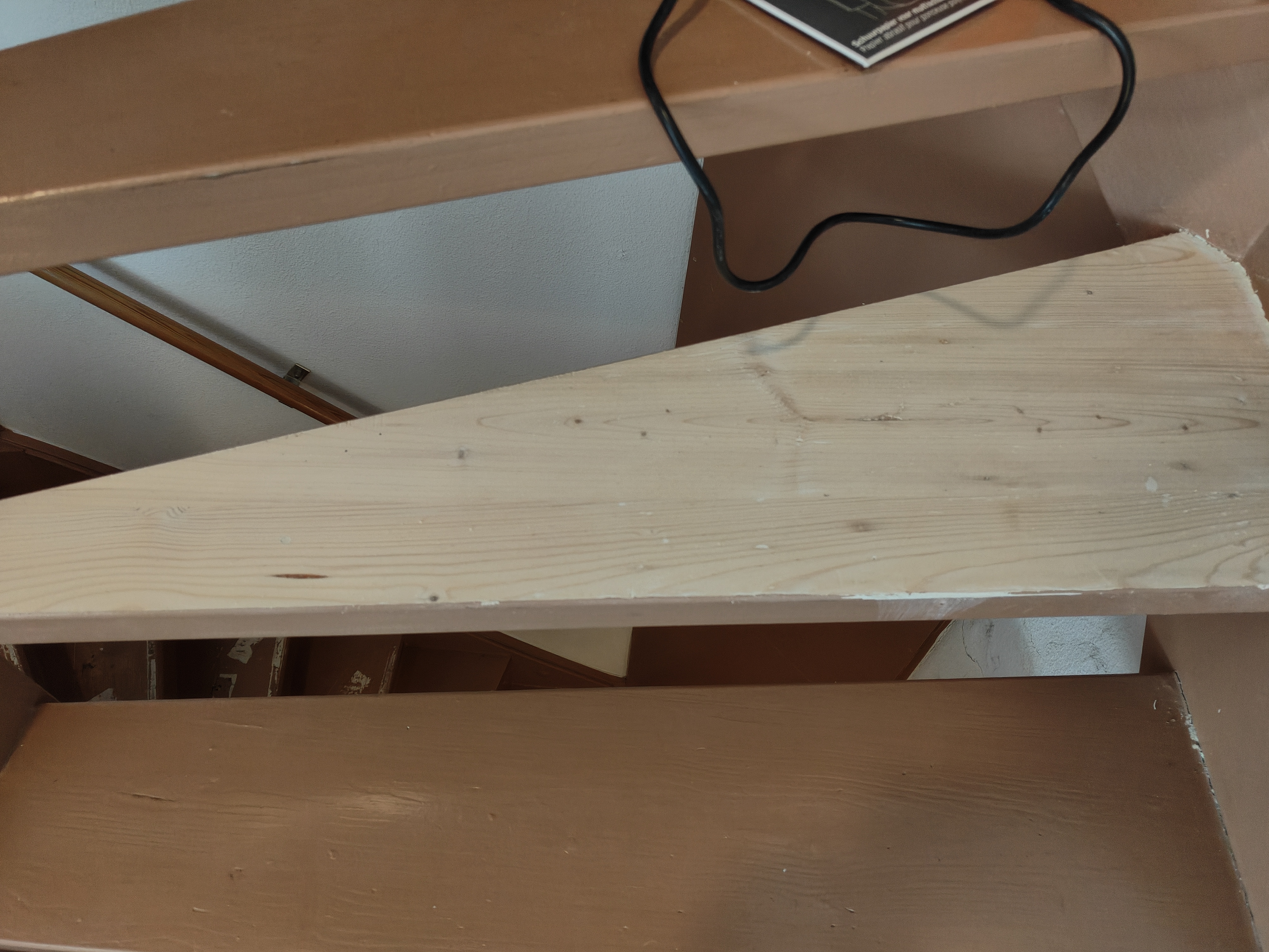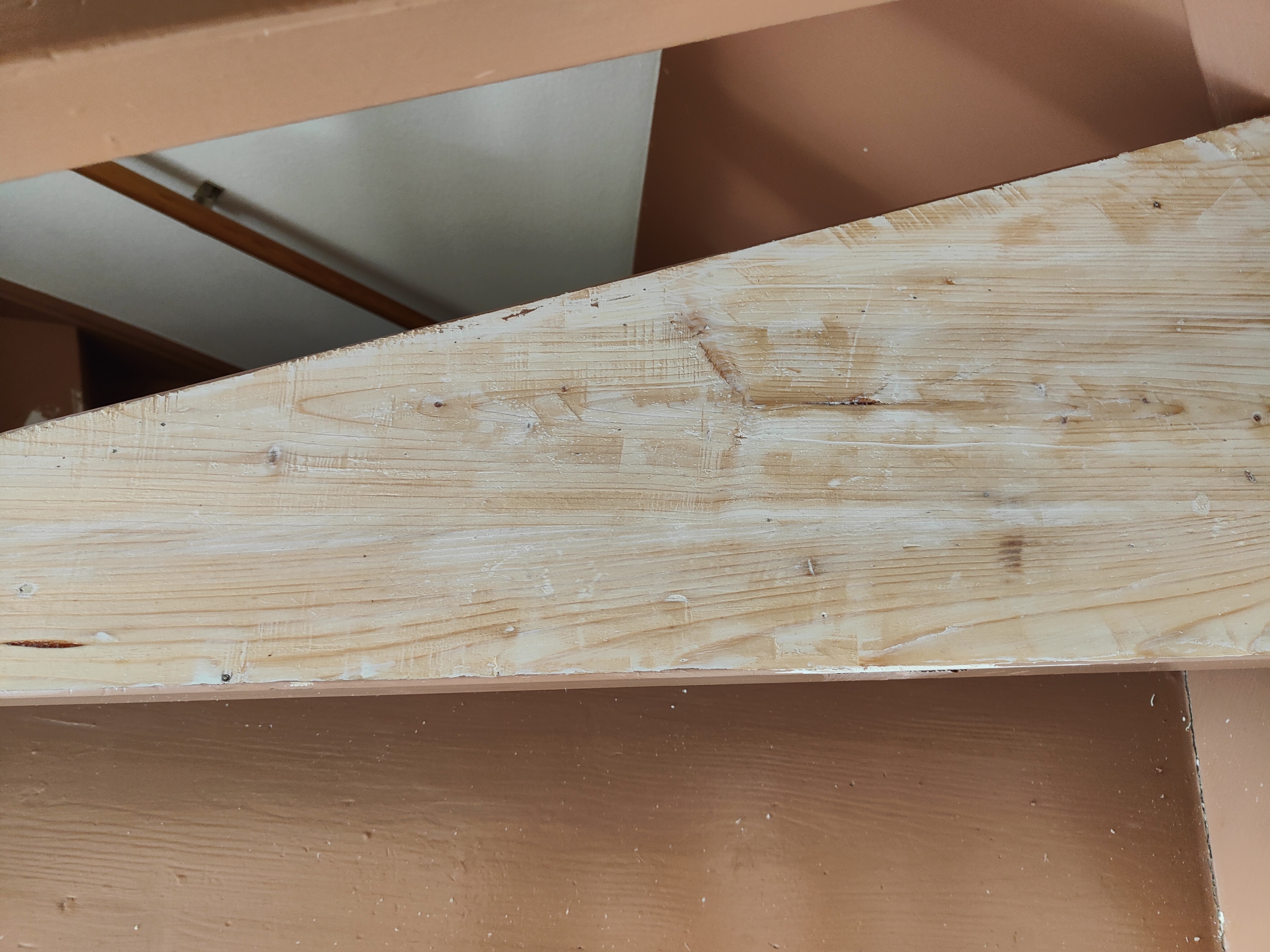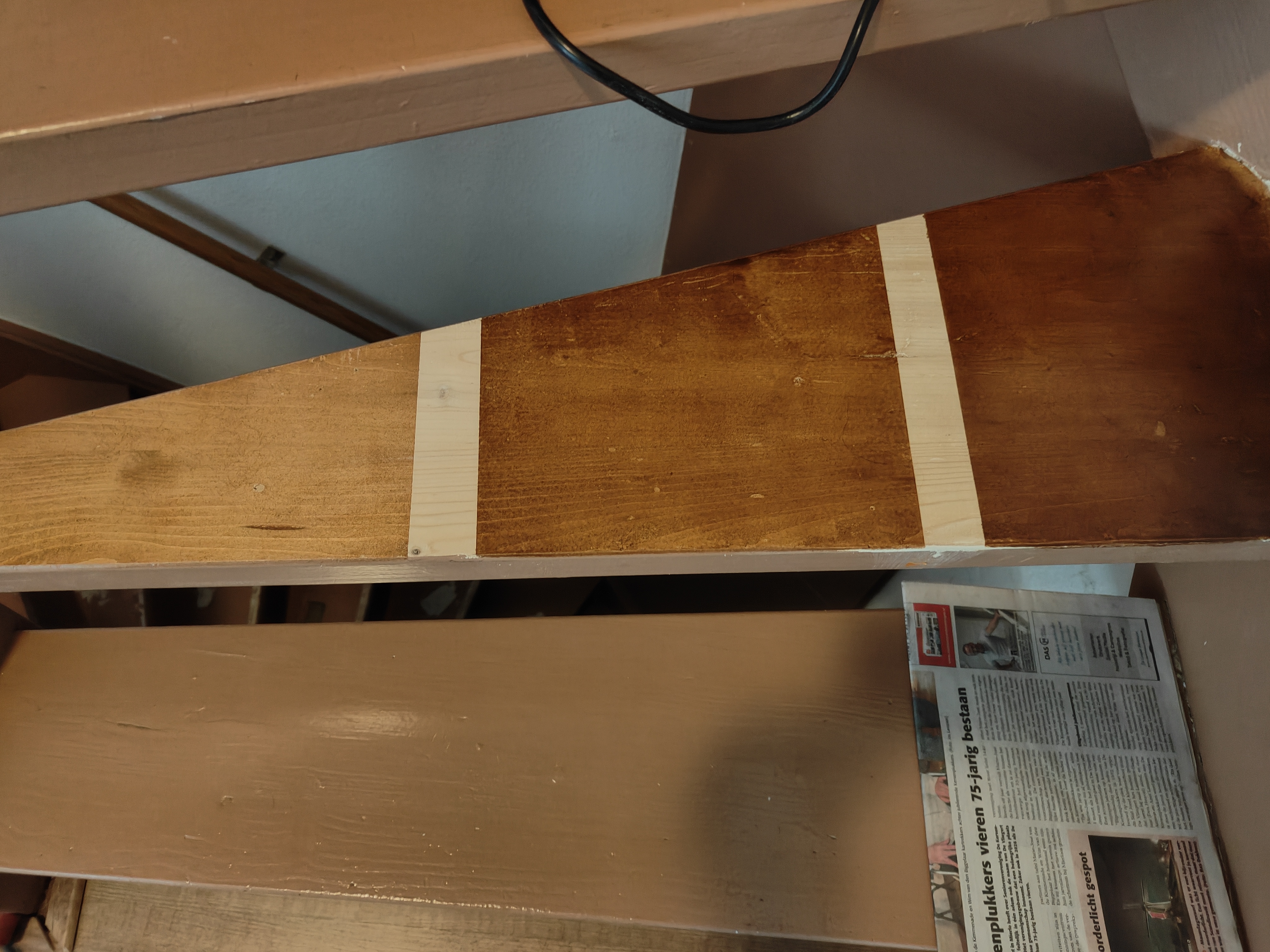 Eerst even de situatie, begane grond naar 1e verdieping is een dichte 2,5 trap, die naar zolder ene open 2,5 trap. Zoals op de foto's te zien is willen we ook de platen die tegen de muur zitten meteen in dezelfde kleur van de trap maken.