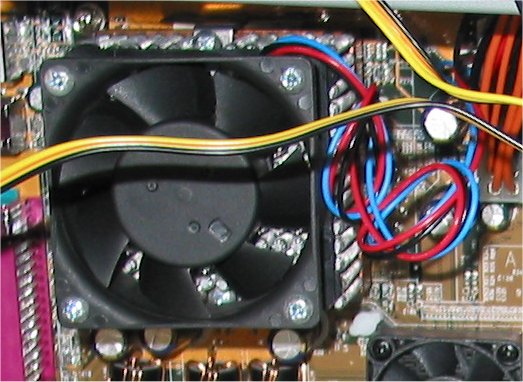 Totale gevaarte is dus 10,5 cm hoog en daar komt dan nog mobodikte + cpu-socket + cpu bij. Hij steekt verder naar zijkant/buiten uit als de voeding en op zo'n 2 cm na steekt hij al tegen de zijklep aan. Bovenop het fanrooster werden ophangijzers gemaakt naar de kast + voeding om de koelvoet meer ondersteuning te geven (moment = kracht x arm -> 720 gram x 10,5 cm!). Voor de zekerheid ook nog maar een copperspacer tussen blok + cpu.