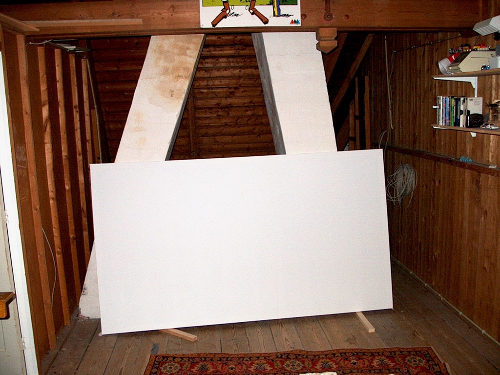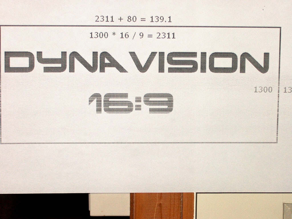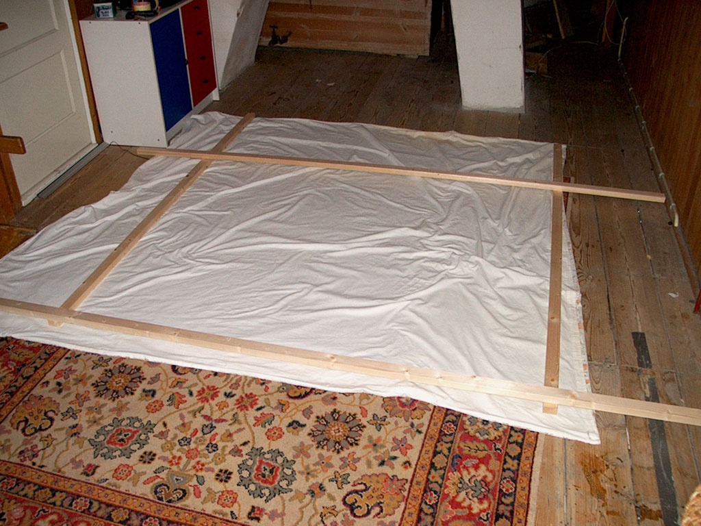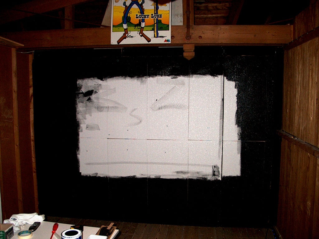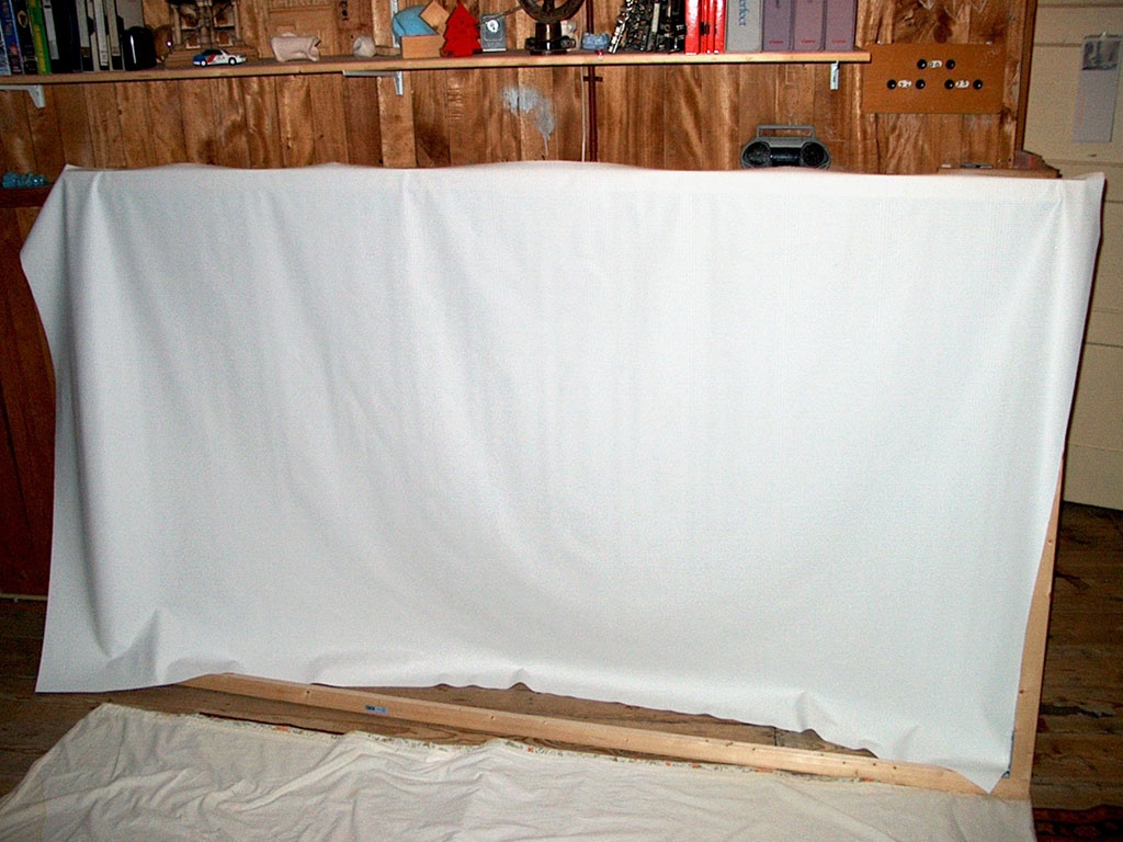 Ik had het doek opgerold om een buis heen. Het frame is af. "Klusser Bolk" heeft het voor mekaar gekregen om vrijwel op de millimeter een 16:9 formaat te creeren.