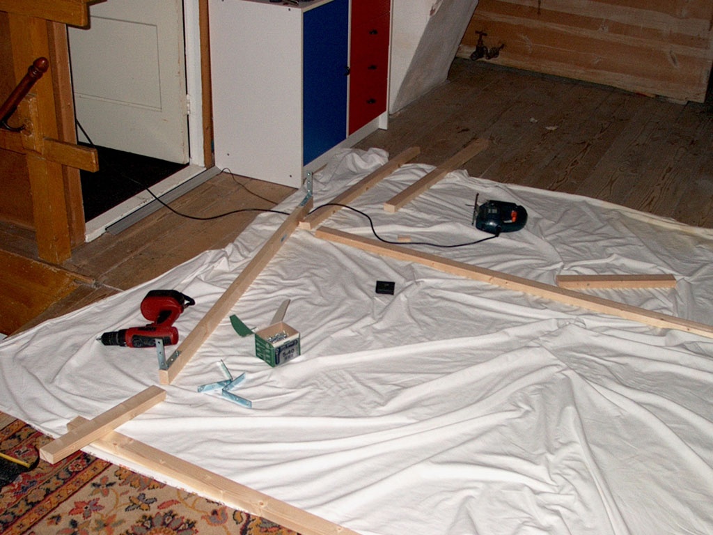 Een doekkie op de grond. Ik heb 4 stukken vurenhout gebruikt. 44 bij 78 cm geloof ik.