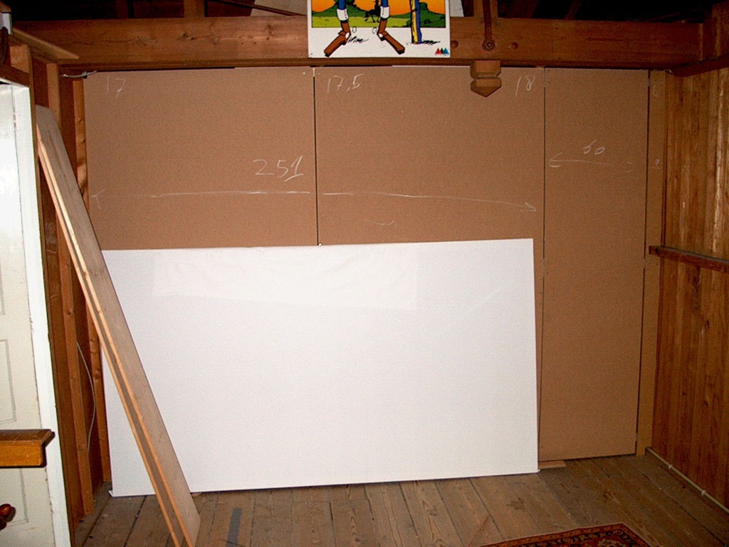 Dat is al wat beter. De kastjes/ planken die aan de muren hangen gaan verdwijnen. Het is de bedoeling om voor de witte schoorstenen het hele geheel te plaatsen.