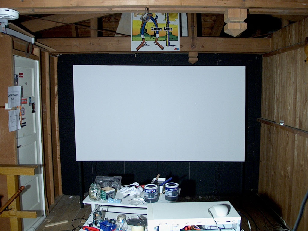 Mijn projectiedoek heb ik inmiddels klaar en kostte me 30euro, en het beeld is beter dan ik ooit had kunnen dromen. Het scherm is 220mx130m, moeten nog afgewerkt worden met zwart velours (5cm rondom). Het doek is verduisteringsdoek van de Kwantum, het voordeel hiervan is dat er geen licht doorheen komt en dat het doek stevig, mat en gemakkelijk te spannen is. Het frame is opgebouwd uit houte balkjes met een diameter van 3cm.