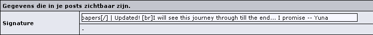 In je edit user scherm kun je instellingen van je account aanpassen, zo ook je signature. Daar staat een vakje invoerveld waarin je je signature moet invullen, daaronder is nog ruimte over en er staat een streepje: '-' in. Nu heb ik altijd gedacht dat op de plaats van dat streepje een voorbeeld van je signature zou moeten staan. Klopt dit? Als dat niet het geval is, waar is dat streepje dan goed voor? En als het nergens goed voor is, zou er dan een voorbeeld van de signature neergezet kunnen worden? Zie ook de meegeleverde afbeelding voor een verduidelijking
