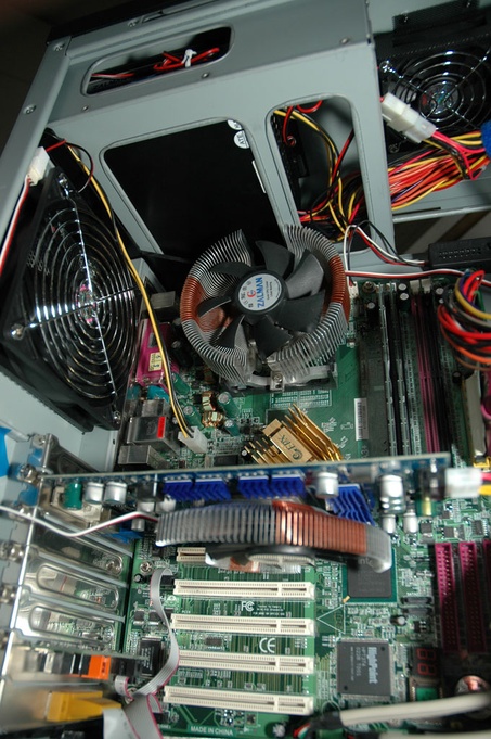 Midden in beeld zie je de grote Coolermaster Heatpipe koelers. Deze zijn oorspronkelijk als passieve koeling bedoeld, maar ik heb er fans op gemod. Logisch natuurlijk, aangezien wij als NGS'ers / DPC'ers allemaal op 100% load draaien en dat het liefst 24/7. Dus was een beetje extra koeling wel handig.